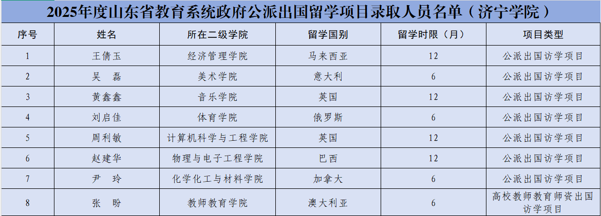 近日,2025年度山东省教育系统政府公派出国留学项目录取人员名单正式发布。根据《关于做好2025年度山东省政府公派出国留学项目申报工作的通知》要求,按照“个人申请、单位推荐、专家评审、择优录取”的原则,该项目共录取278人。我校8名教师成功入选,其中公派出国访学项目7人,高校教师教育师资出国访学项目1人,申报获批率达100%,获批人数创我校历史新高,位居省属同类本科高校前列。