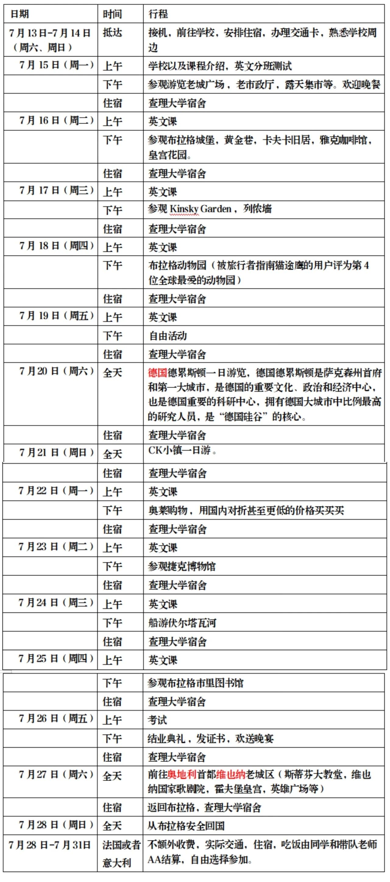 费用包含:为期两周的课程、参访,住宿。布拉格当地交通,德国、奥地利参访,保险等费用。